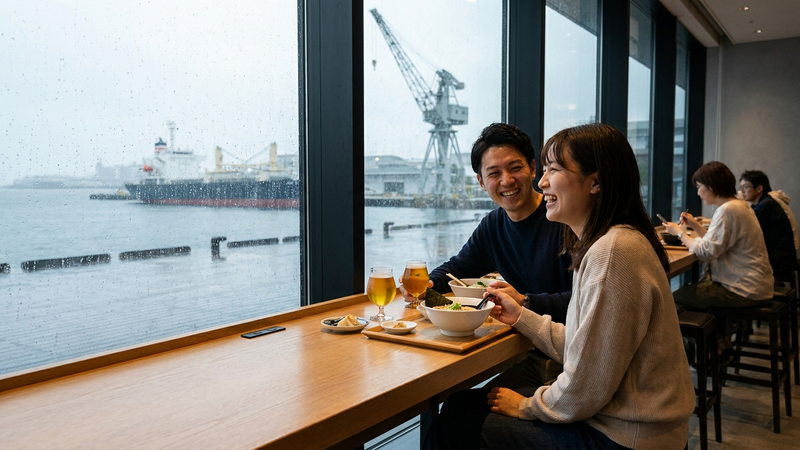 グルメだけでなく、日本初の体験型フードファクトリー「JAPAN RAMEN FOOD HALL」では、自分だけのオリジナルラーメン作り体験も楽しめます。食事やショッピングをしながら、海を望む窓から雨の日の港の景色を眺めるのも、また一興。おしゃれな空間で、ゆったりと大人の時間を過ごしたいカップルに候補のひとつです。特別なデートを演出してくれる、魅力的な施設ですよ。