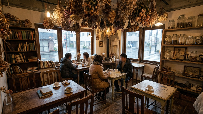 店内には季節ごとに変わるドライフラワーが豊富に飾られ、まるで秘密の花園に迷い込んだかのよう。雨の日には、窓の外の景色とは対照的な温かく美しい空間で、ゆったりとした時間を過ごすのが候補のひとつです。デートや友人との語らいにはもちろん、一人で本を読んだり物思いにふけるのにも最適。高円寺の雨の日を、より一層特別な思い出に変えてくれるでしょう。